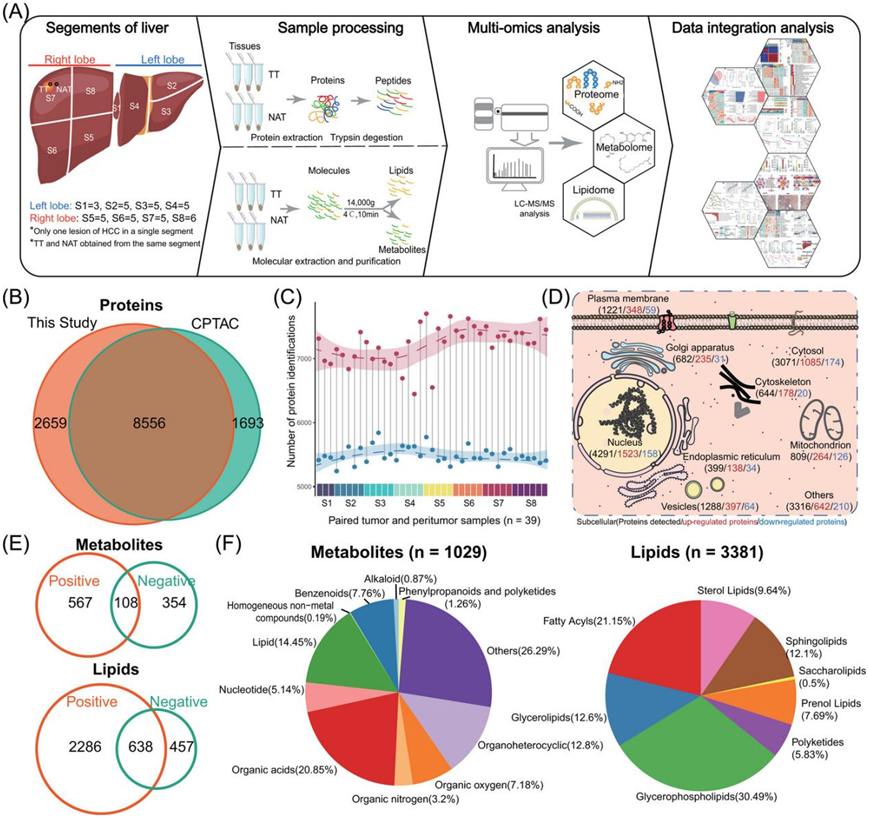 (A) 实验和综合多组学分析的示意图摘要,包括肝脏分割、非靶向 LC-MS/MS 数据生成和整合分析。(B) 维恩图描绘了本研究和 CPTAC HCC 队列的重叠蛋白质。(C) 分段解析的 HCC 样本中蛋白质鉴定的概览。由套索回归拟合的虚线表示蛋白质鉴定的分布。套索曲线下面的阴影表示 95% 置信区间。(D) 通过人类蛋白质图谱研究的已鉴定蛋白质的亚细胞分布。(E) 维恩图显示在 LC-MS/MS 的正离子和负离子模式下鉴定的重叠代谢物和脂质。(F) 饼图显示了由人类代谢物数据库 (HMDB) 注释的已鉴定代谢物和脂质的类别。