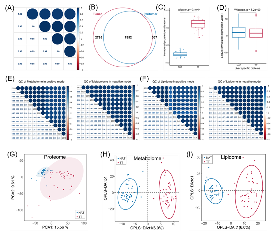 (A)质谱分析。(B)维恩图描绘了TT和NAT样品中鉴定的重叠蛋白。(C)箱线图分别显示了TT和NAT样品中鉴定出的蛋白质数量。(D)NAT组和TT组之间肝脏特异性蛋白相对表达的方框图。(E-F)代谢组和脂质组的QC样品分别在正/负离子模式中使用与蛋白质组分析质量控制相同的方法进行分析。(G)蛋白质组学数据的主成分分析(PCA)在很大程度上分离了肿瘤样本和NAT样本。(H-I)TT和NAT样品中代谢组和脂质组的正交偏最小二乘判别分析(OPLS-DA)。TT:肿瘤组织;NAT:正常邻近组织。
