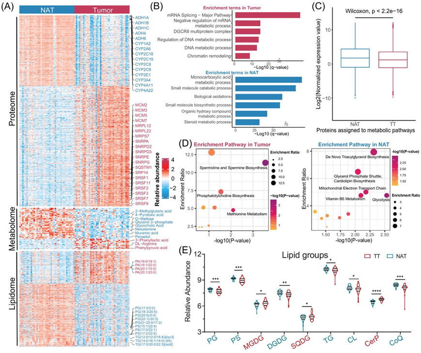 (A)热图显示 TT 和 NAT 样本中的蛋白质、代谢物和脂质概况。(B)条形图表示基于 TT 和 NAT 之间失调蛋白质的富集通路。(C)NAT 和 TT 组之间分配给代谢途径的蛋白质相对表达的箱线图。(D)基于 TT 和 NAT 之间失调代谢物的富集途径的散点图表示。(E)TT 和 NAT 中失调脂质组的小提琴图。