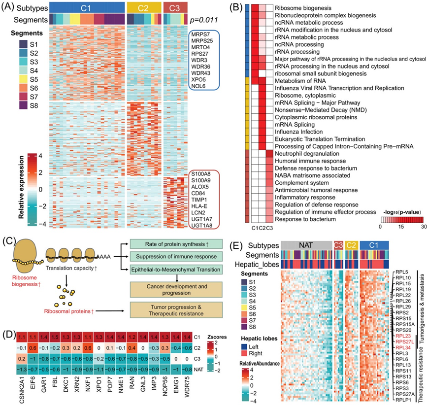 (A) 三种蛋白质组亚型中上调蛋白质的相对表达和肝节段关联。(B) 不同通路中显著差异表达蛋白质。(C)系统图总结了癌症发展和进展中失调的核糖体生物合成。(D)蛋白质组亚型和 NAT 样本中与核糖体生物合成相关的失调蛋白质。每个细胞的颜色显示该样本中蛋白质的Z分数。(E)蛋白质组亚型和 NAT 样本中核糖体蛋白 (RP) 的相对表达。