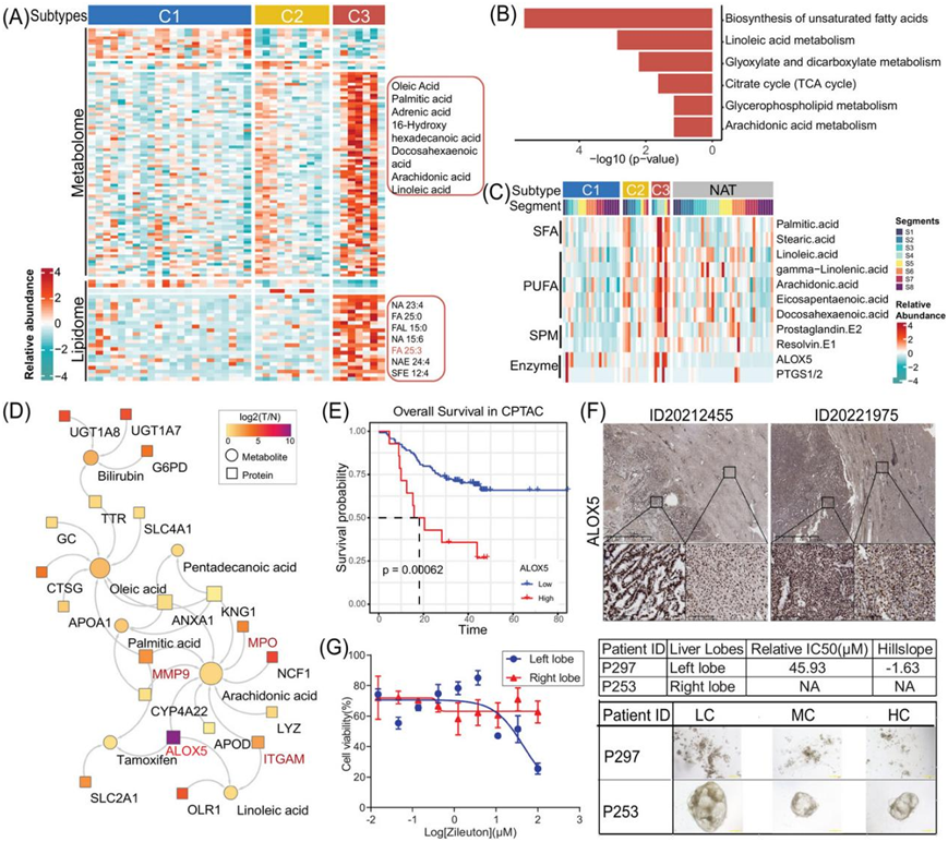 (A)热图显示 HCC 亚型中代谢组和脂质组的失调。(B)与其他亚型相比,C3 亚型中这些上调代谢物的 MSEA。(C)热图显示 HCC 亚型和 NAT 中 SFA、PUFA、SPM 和酶的相对表达。(D)脂肪酸与受调节蛋白质的相互作用。(E) CPTAC HCC 队列中 ALOX5 总体生存率的 Kaplan-Meier 曲线。(F) 来自两名独立患者(ID20212455 和 20221975)的 IHC 分析验证了 TT 和 NAT 样本中 ALOX5 的表达。 (G) 从 HCC 肿瘤组织中获得的 PDO 对 ALOX5i敏感,左叶的 IC50为 45.93 µM,但右叶不敏感。