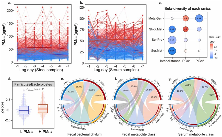 (a-b) 粪便和血清样本的暴露轨迹分别建模。(c) 显示 PM2.5 暴露组之间每个组学类别的 β 多样性指数的标准化平均差异 (SMD) 。(d) 说明 PM2.5暴露组之间厚壁菌门/拟杆菌门比率差异的 Z 分数。(e-g) 分别描述H-PM2.5组和 L-PM2.5组之间细菌门组成以及粪便和血清代谢物分类的差异。