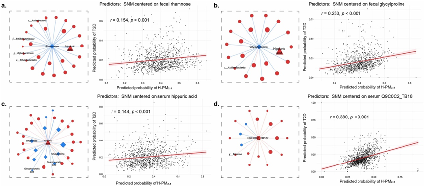 在本研究中,他们观察到,在一个包含 129 个节点和 509 条边的网络中,与整个参与者群体相比,T2D 受试者中的 PM2.5 相关生物标志物之间的相关性较弱(图 4d-e)。在网络中前 10 个关键节点中,有 4 个(粪便代谢物鼠李糖和甘氨酰脯氨酸、血清代谢物马尿酸和蛋白质 TB182)是模型Ⅱ中的主要 PM 2.5相关生物标志物,是关键枢纽节点。