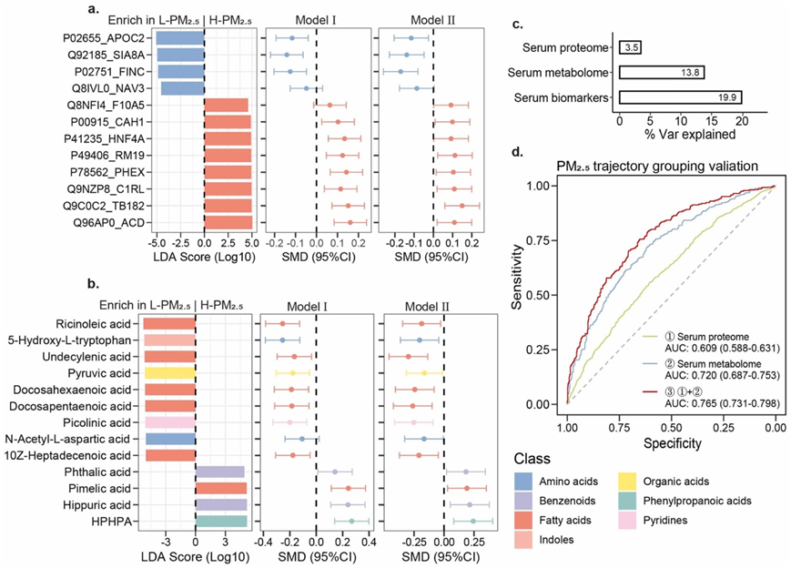 (a) 显示组间差异显著以及模型Ⅱ中 H- 和 L-PM2.5 组间差异显著(FDR p < 0.1)的宿主血清蛋白质的 LDA 得分和 SMD。(b) 在组间分析中以及模型Ⅱ中 H- 和 L-PM 2.5组间差异显著的血清代谢物。(c) 表示由宿主血清代谢组、蛋白质组的生物标志物及其联合效应解释的 PM2.5 分组的 变异百分比。(d) 显示基于筛选指标的 PM2.5分组效度预测模型的 ROC-AUC。