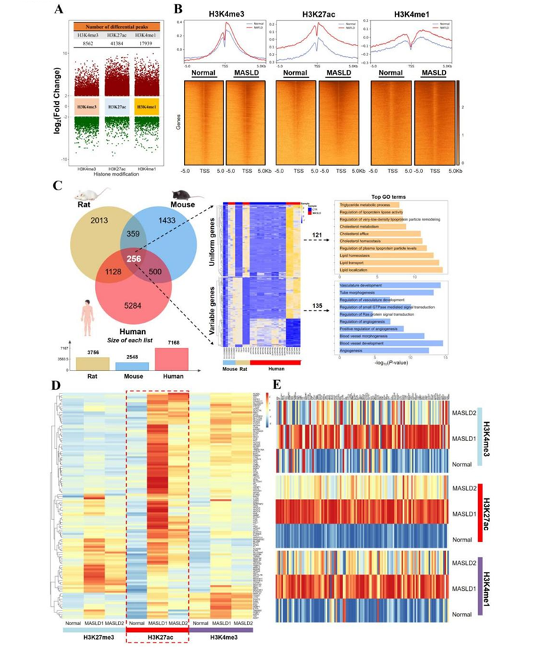 为了研究基因表达在 MASLD 发病机制中的表观遗传调控,研究团队首先利用健康和 MASLD 患者(GSE112221)的 ChIP-seq 数据来建立组蛋白修饰标记的全基因组模式,包括 H3K4me3(活性启动子)、H3K27ac(活性增强子)和 H3K4me1(活性/平衡增强子)。值得注意的是,H3K27ac 在正常人和患者之间有显著区别(图S1A-B),表明 H3K27ac 在调节疾病状态中起着关键作用。随后,他们整合了来自人类、大鼠和小鼠样本的转录组分析(RNA-seq)数据,鉴定出 256 个跨物种重叠基因,其中 121 个基因在受 MASLD 影响的样本中持续上调,涉及脂质代谢过程(图S1C)。他们进一步分析了这些均一基因的峰值热图,并在所有组蛋白样本中进行了标准化(图S1D-E),证实样本主要根据 H3K27ac 标记的疾病状态进行分组,这证明了 H3K27ac 在调节这些基因在物种间 MASLD 发展中的关键作用。