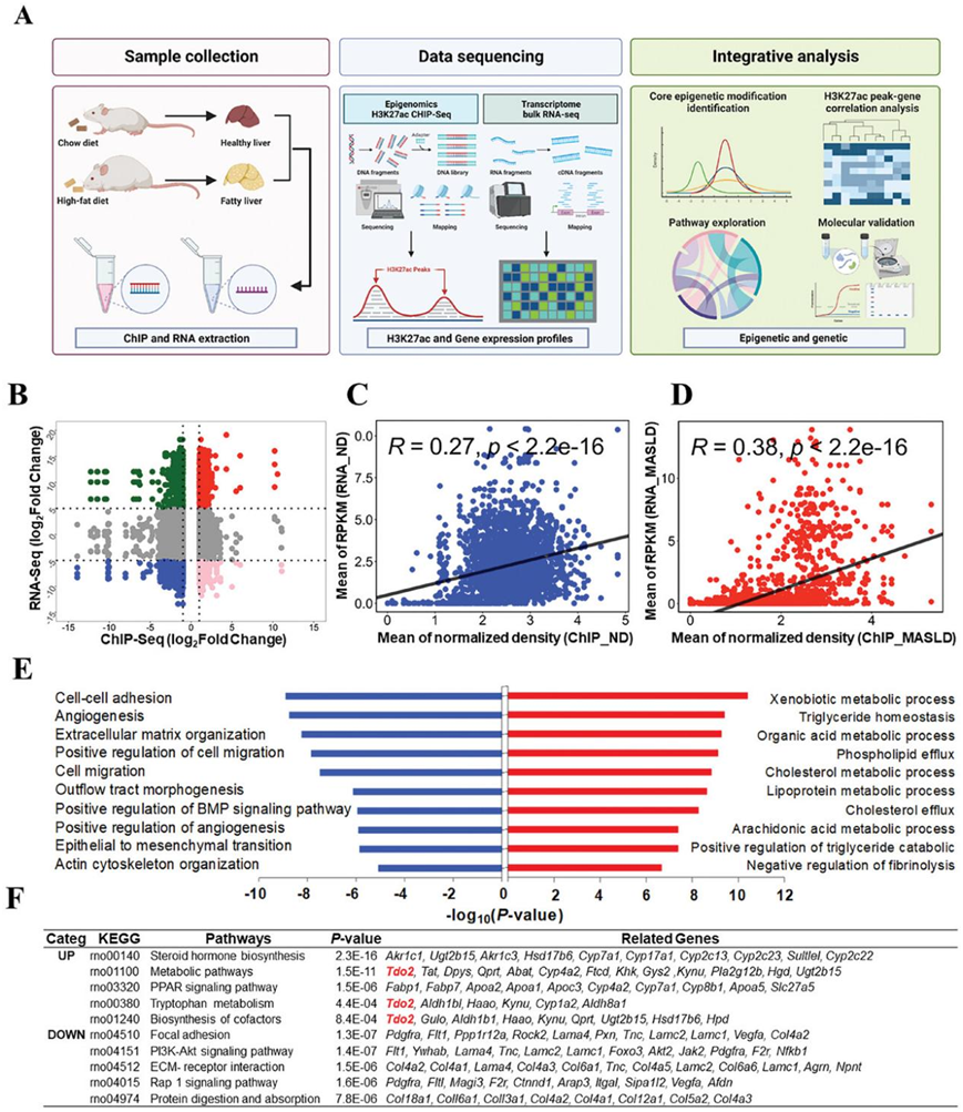 (A) 识别 MASLD 进展中核心表观遗传和遗传生物标志物的策略示意图。(B) 全基因组“四向”图显示显著变化的基因。(C) ND 组 ChIP-seq 的 H3K27ac 峰与 RNA-Seq 的基因表达呈正相关。(D) MASLD 组 ChIP-Seq 的 H3K27ac 峰与 RNA-Seq 的基因表达呈正相关。(E) 过度代表 PP 和 NN 假定峰靶基因的生物学过程。(F) KEGG 通路分析。