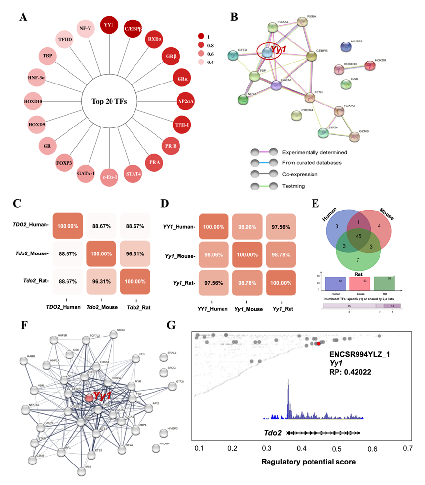(A) 前20位预测TF与TDO2的增强子和启动子结合。(B) 前20名TF的PPI网络。(C-D) 基于Uniprot数据库(https://www.uniprot.org/)的人、大鼠和小鼠TDO2和YY1序列保守性分析。(E) 分别为人(蓝色)、小鼠(红色)和大鼠(绿色)的TDO2推定TF的维恩图。(F) 通过构建重叠45个TF的PPI网络验证YY1的同源性。(G) 根据Cistrome数据库(登录号:ENCSR994YLZ_1)鉴定Y Y1为TDO2基因的潜在调控因子。