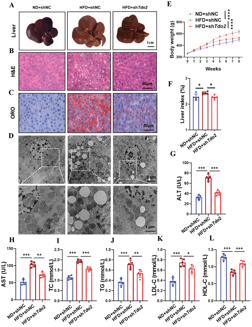 为了进一步确定Tdo2在肝脏脂质积累中的病理作用,将携带针对TDO2的 shRNA 的慢病毒(shTdo2)通过尾静脉注射到 HFD 诱导的大鼠体内。在注射 sh Tdo2慢病毒后,HFD 诱导的大鼠肝组织中升高的 TDO2 表达显著降低。功能上,肝脏的外观在Tdo2抑制后明显改变,从 HFD 诱导的浅黄色(边缘较厚、表面油腻)变为深红色(边缘更锋利、表面更光滑)(图 5A)。此外,H&E 染色(图5B)、油红 O 染色(图 5C)和透射电子显微镜(图 5D)证明,注射 sh Tdo2可显著减少 HFD 诱导的大鼠肝脏中的严重脂肪变性和脂质积累。此外,TDO2敲低导致 HFD 喂养大鼠的体重和肝脏指数增加均显着降低(图 5E-F)。此外,HFD 诱导大鼠血清 ALT、AST、TC、TG、LDL-C 水平升高和血清 HDL-C 水平降低因TDO2耗竭而明显逆转(图 5G-L)。因此,肝脏TDO2的损失减轻了 HFD 喂养大鼠的肝脏脂肪变性。
