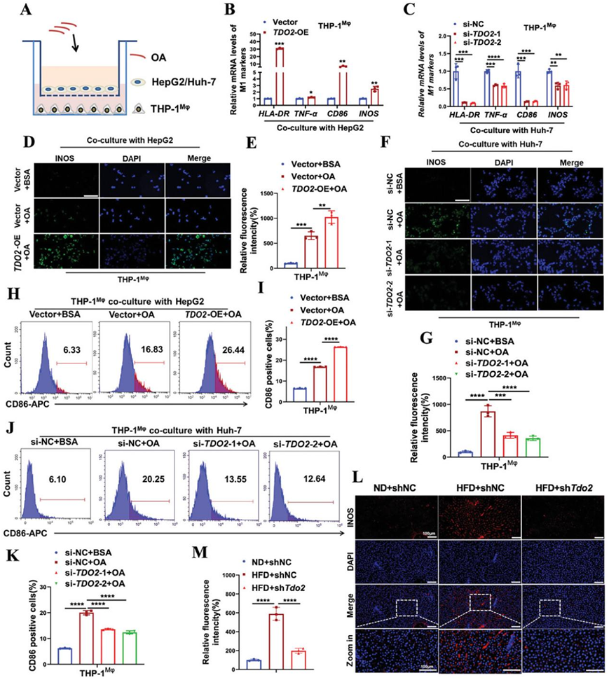 据报道,诱导炎症性M1巨噬细胞极化可促进MASLD的发展。为了探索TDO2是否通过改变巨噬细胞极化来促进脂质积累,他们建立了OA诱导的HepG2/Huh-7细胞和THP-1衍生的巨噬细胞共培养体系(图 6A)。鉴于HepG2细胞中内源性TDO2水平较低,而Huh-7细胞中内源性TDO2水平较高,因此在HepG2细胞中过表达TDO2,而在Huh-7细胞中则敲除TDO2,以便随后进行功能和机制研究。正如预期的那样,qRT-PCR 分析表明,在 HepG2 细胞中过表达TDO2显著增强了与 OA 诱导共培养的巨噬细胞中 M1 标志物(HLA-DR和TNF-α)的表达(图6B),而用TDO2 siRNA 转染的 Huh-7 细胞对 M1 标志物的表达表现出相反的影响(图 6C)。免疫荧光染色表明,当与添加 OA 的过表达TDO2的 HepG2 细胞共培养时,巨噬细胞中的 iNOS 蛋白水平增强(图6D-E),但当与TDO2消耗的 Huh-7 细胞共培养时,iNOS 蛋白水平受到抑制(图 6F-G)。流式细胞分析表明,在HepG2细胞中强制表达TDO2可进一步促进OA引起的 CD86+巨噬细胞百分比的增加(图6H-I),而在Huh-7细胞中敲低TDO2可降低OA引起的CD86+巨噬细胞百分比的增加(图 6J-K)。此外,敲除TDO2可显著抑制HFD喂养大鼠肝组织切片中iNOS表达的增加(图 6L-M)。