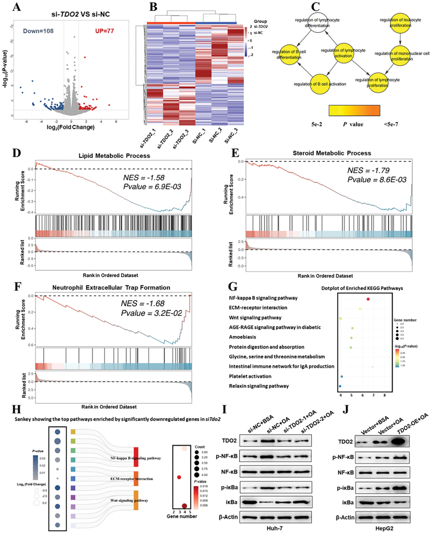 (a) si Tdo2和siNC组之间显著差异表达基因的火山图。(b) si Tdo2和siNC组之间差异表达基因的转录谱。(C)炎症反应网络。(D-F) 基因集富集分析(GSEA)。(G) KEGG通路分析。(H) 桑基图显示si Tdo2组中显著下调的基因富集的前三条通路。(I-J)免疫印迹分析。