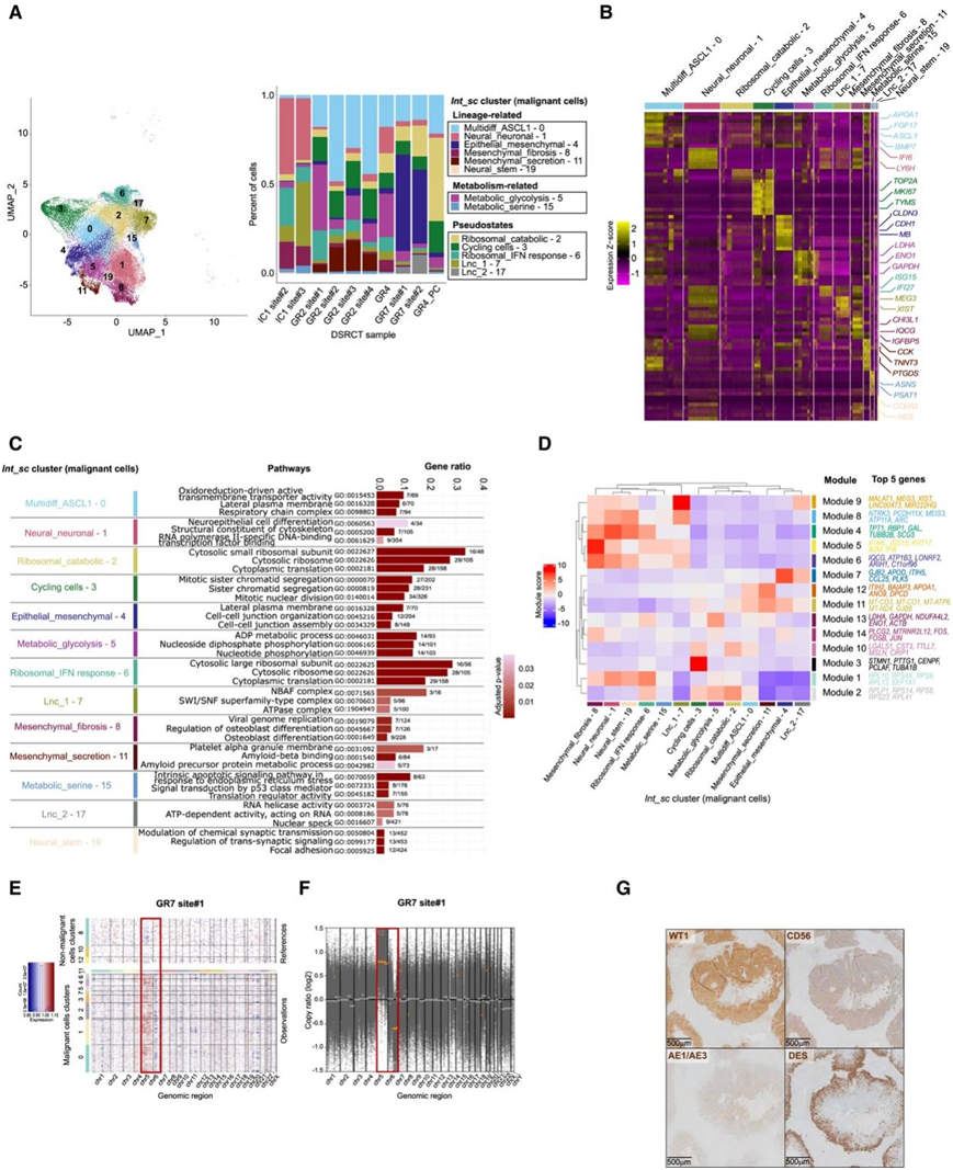 (A)UMAP(左图)和条形图(右图)突出显示单个数据集中的 DSRCT 恶性细胞聚类。(B) 热图显示每个 DSRCT 恶性细胞聚类前 50 个 DEG 的表达Z分数。(C) DSRCT 恶性细胞聚类中前 3 个通路。(D) HotSpot 共表达基因模块的层次聚类。(E)单细胞水平拷贝数变异 (CNV) 推断。(F)对 GR7 位点#1 进行 WES 衍生的 CNV 分析。(G) DSRCT 样本上 WT1、AE1/AE3、DES 和 CD56 的代表性 IHC 染色。