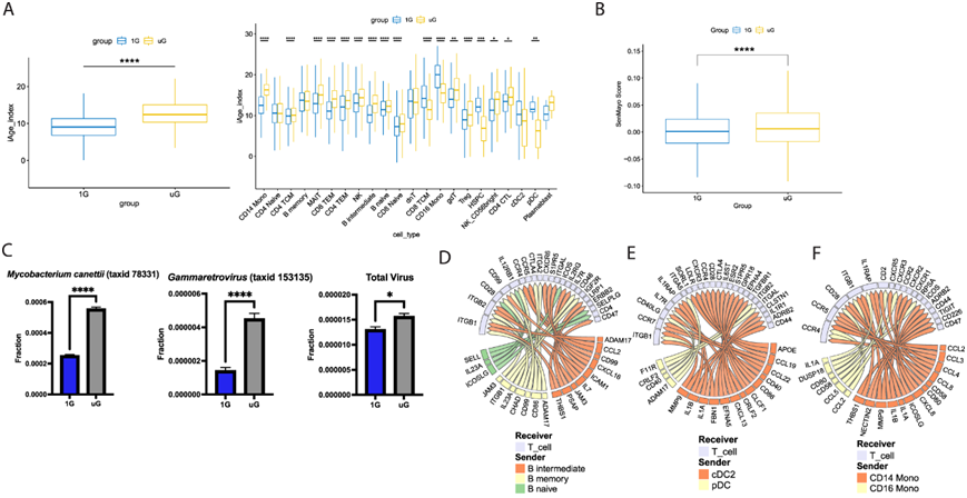 (a) 1G 或模拟 uG 下所有细胞类型(左)和 22 种单独免疫细胞类型(右)之间的 iAge 指数差异。(b) 根据SenMayo基因集计算的细胞衰老分泌产物评分在1G或模拟uG下所有细胞类型之间的差异。(c) 分枝杆菌、逆转录病毒和总病毒丰度在1G和uG条件下的宏转录组检测。 (d-f) NicheNet 预测在 uG 与 1G 条件下(即在 uG 中诱导超过 1G), 总 T 细胞(接收器)和抗原呈递细胞(发送器)之间的显著配体-受体相互作用。
