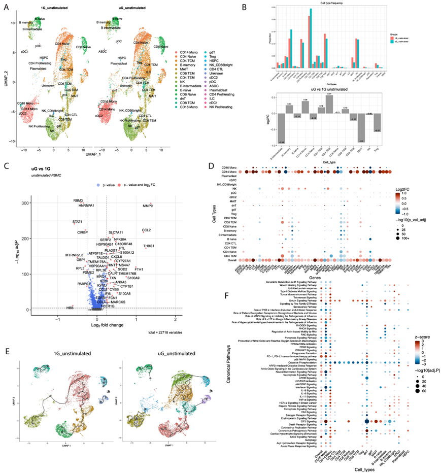 (a) UMAP可视化。(b) 在模拟 uG 和 1G 条件之间,通过百分比或 log2Fold Change (FC) 对每个单个 PBMC聚类的相对丰度进行量化。 (c) uG 和 1G之间所有免疫细胞类型的差异表达基因 (DEG) 的火山图。(d) 点图显示DEG及其在 22 个免疫细胞群中的表达水平。 (e) 1G 和模拟 uG 未刺激 PBMC的轨迹分析的UMAP。(f) 从Ingenuity Pathway Analysis (IPA) 获得的典型通路富集分析显示在 19 个免疫细胞聚类中。