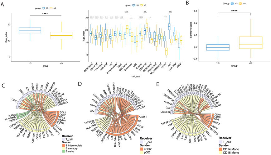 (a) 在 1G 或模拟 uG 中 TLR7/8 激动剂激活后,所有细胞类型(左)和 19 种单个免疫细胞类型(右)之间的 iAge 指数差异。(b) 使用TLR7/8激动剂激活1G或模拟uG的所有细胞类型之间,根据SenMayo基因集计算的细胞衰老分泌产物评分的差异。(c-e) NicheNet预测了总T细胞(受体)和抗原呈递细胞(发送者)之间显著的配体-受体相互作用。