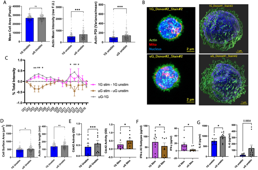 (a) 在 25 小时的 1G 或模拟 uG 之间,对肌动蛋白进行 2D 超分辨率显微镜分析,以了解细胞面积(左)、强度(中)和纹理(右)。 (b) 代表性超分辨率显微镜图像(左图为 2D,右图为 3D)。(c) 用TLR7/8激动剂刺激的PBMC的16通道粒度光谱测量。(d) 在1G或模拟uG的25小时内,超分辨率显微镜分析三维肌动蛋白表面积(左)和肌动蛋白尖峰长度(右)。(e) gtp结合Cdc42活性。(f) 用 TLR7/8 激动剂(16 小时调节 + 9 小时刺激)处理的 PBMC从 1G 和模拟 uG 分泌的 IFN 的 ELISA 水平。(g) ELISA法测定PBMC在模拟uG和1G作用25小时后分泌的IL水平。