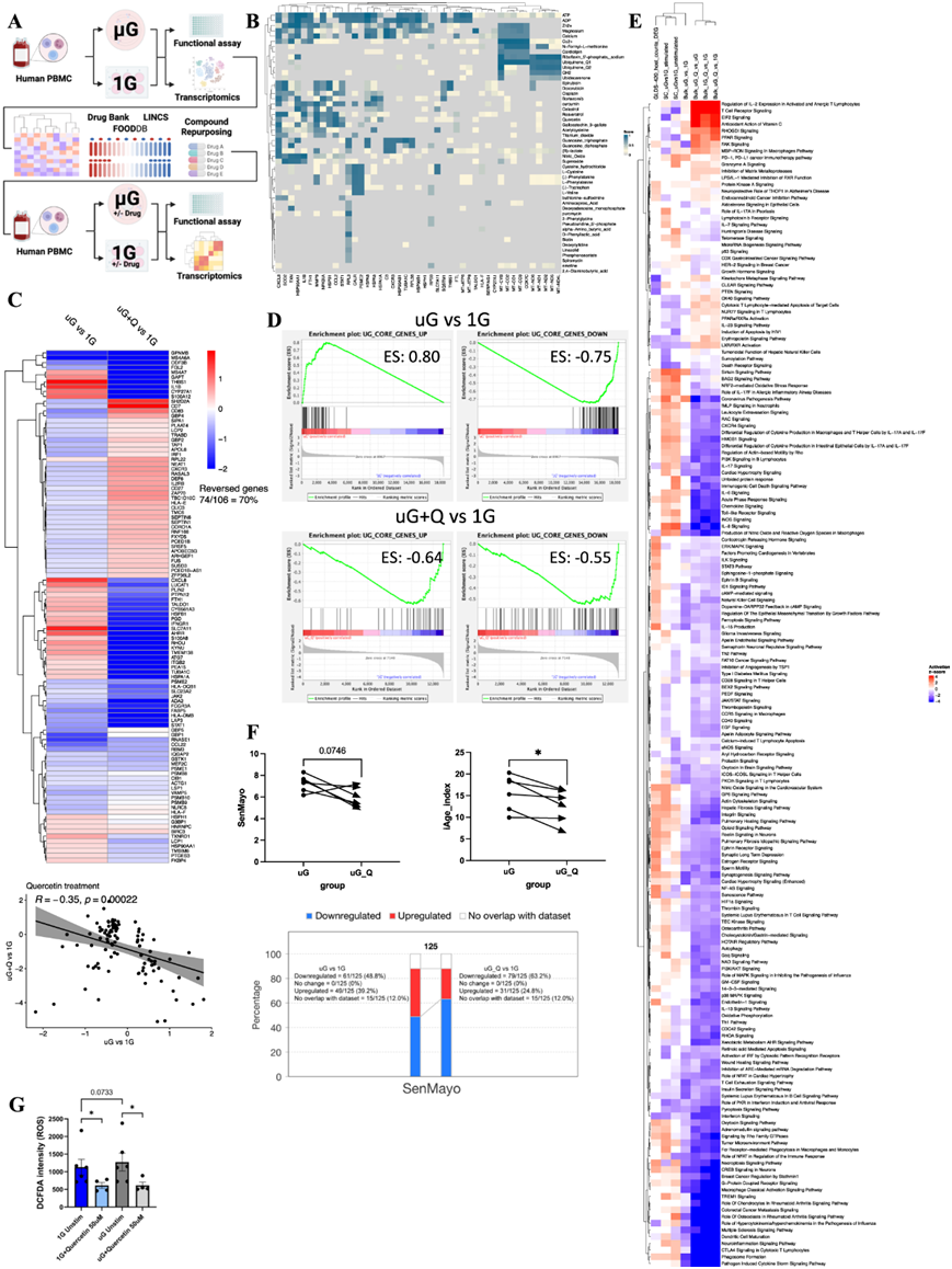 (a) 微重力和基因相互作用化合物从发现到验证的流程。 (b) 前50 个模拟 uG 改变基因与化合物相互作用候选物的热图。(c) 槲皮素 (50 μM) 逆转了模拟 uG (25 小时)中的核心基因表达特征。(d) 基因 集富集分析 (GSEA)。(e) IPA槲皮素改变的典型途径。(f) 槲皮素可降低衰老和与年龄相关的炎症基因输出。 (g) 槲皮素降低了ROS 水平。