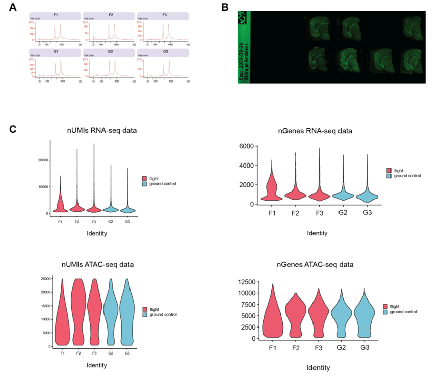 为了识别受太空飞行影响的特定细胞微环境,研究团队将空间转录组学 (ST) 技术和单细胞核多组学 (snMultiomics)技术(包括单细胞核染色质可及性分析:snATAC-seq、单细胞核转录组分析:snRNA-seq)结合用于小鼠大脑。总共,他们分析了在国际空间站 (ISS) 上安乐死的三只小鼠的大脑和在匹配条件下饲养的地面对照小鼠的三只大脑。对于每个样本,从一侧半球分离细胞核进行 snMultiomics 分析,并对另一侧半球进行冷冻切片以进行 ST 分析,重点关注海马区域(图 1)。