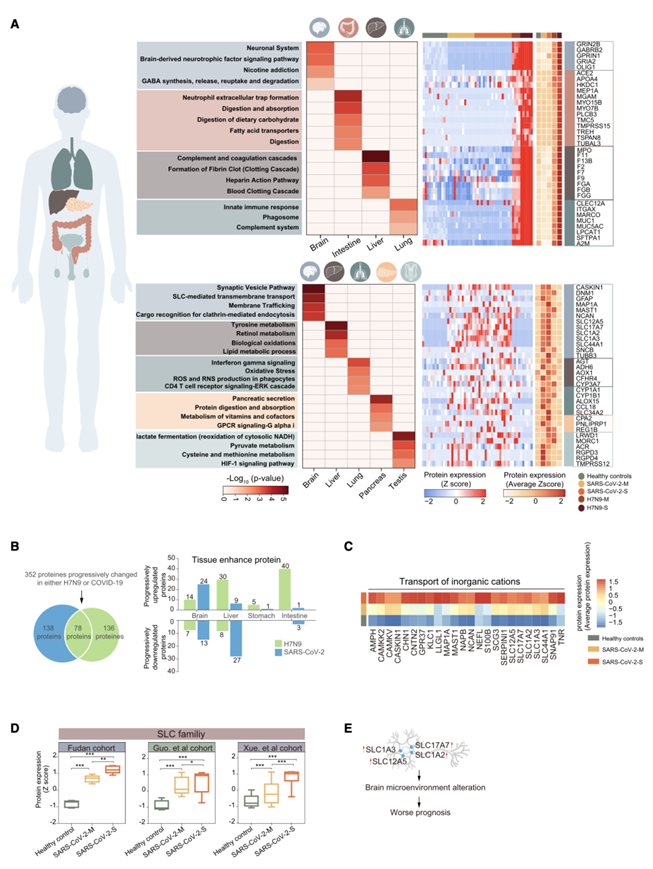 (A) 系统图总结了在不同病毒感染下显著升高的蛋白质和信号级联。(B) 维恩图和条形图显示表现出渐进性改变的组织增强蛋白质。(C) 热图展示了调节无机阳离子运输的脑增强蛋白质的表达模式。(D) 箱线图显示健康对照者和不同综合征的 SARS-CoV-2 病毒感染患者中 SLC 家族成员的蛋白质表达水平。(E) 系统图总结了血清中 SLC 蛋白的上调,表明脑环境改变和预后不良。