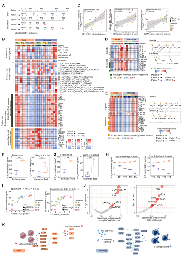 (A) 每个 H7N9 患者的样本采集时间表。(B) 热图显示了不同组 TP 的细胞类型组成(第一部分)、选定蛋白质的丰度(第二部分)和通路(第三部分)。(C) 细胞类型特征的蛋白质表达与临床检测到的绝对细胞计数的 Spearman 等级相关性。(D-E) 左侧的热图显示不同组中不同 TP 的配体和受体的表达模式。右侧的配体-受体接触图显示了配体与其同源受体之间的网络。(F-G) 箱线图比较了本研究队列(左)和公开队列(右)中出院组和死亡组之间的 IL-8和 IL-6浓度。 (H) 箱线图显示了 TP 中临床检测到的 IL-8(左)和 IL-6(右)浓度。(I) 蛋白质表达与临床检测到的 IL-8 和 IL-6 的 Spearman 等级相关性。(J) 火山图显示配体的蛋白质表达与中性粒细胞(左)和 T 细胞(右)的 xCell 信息细胞类型富集分数之间的相关性。(K) 图表总结了不同组中重要的蛋白质和信号变化。