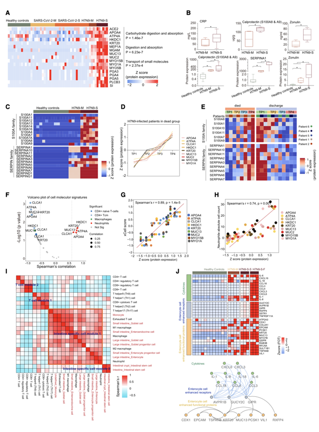 (A) 热图呈现了样本中肠道增强蛋白的表达模式。(B) 箱线图显示了临床检测到的 CRP、钙卫蛋白和连蛋白(上)以及样本中 S100A8/A9(钙卫蛋白)、SERPINA1 和连蛋白(下)的蛋白质表达的比较。(C) 热图呈现了不同综合征样本中 S100A 和 SERPIN 家族蛋白质的表达模式。(D) 线图显示预后不良的 H7N9 病毒感染患者中肠道增强蛋白在 TP 中的动态表达模式。(E) 热图展示了不同组 TP 中属于 S100A 和 SERPIN 家族的蛋白质的表达模式。(F) 火山图显示了肠道增强蛋白表达与细胞类型的 GSVA 评分之间的相关性。(G-H)肠道增强蛋白的蛋白质表达与 GSVA 评分和中性粒细胞绝对计数的 Spearman 等级相关性。(I) 热图显示肠道特异性细胞类型和免疫细胞类型的共同富集模块。(J) 热图显示了各组蛋白的表达情况:细胞因子(上)、肠细胞增强受体(中)和与肠细胞基本功能相关的蛋白(下)。