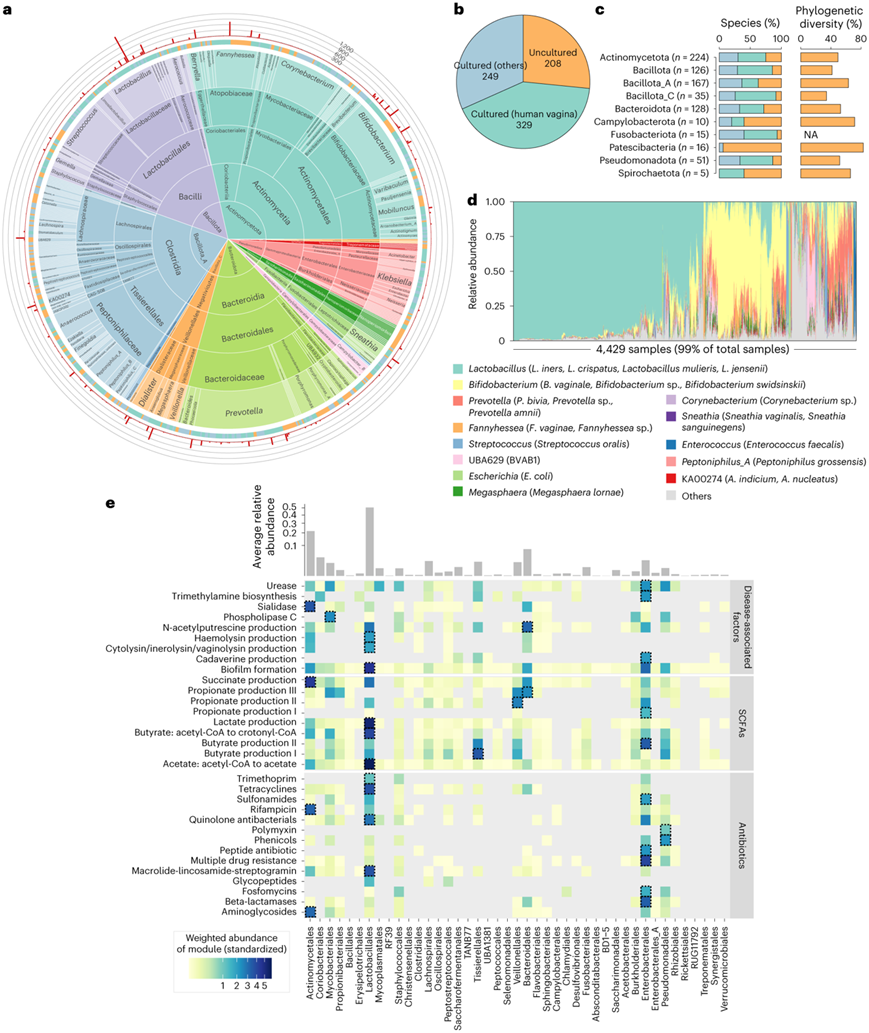 (a) 原核生物物种的分类。(b) 未培养物种、从阴道培养的物种和从非阴道部位培养的物种的数量。(c) 不同门中未培养物种、从阴道培养的物种和从非阴道部位培养的物种的比例,以及未培养物种所占的系统发育多样性比例。(d) 4429 个阴道宏基因组中占主导地位的属。(e) 阴道样本中每个目不同功能模块的加权丰度。