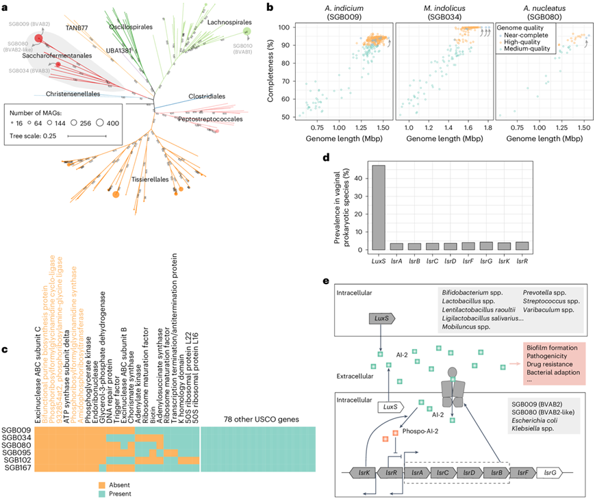 (a) VMGC 中梭菌纲所有物种的系统发育树。 (b) 基于 CheckM2 算法的糖发酵目三个主要成员的基因组完整性得分和基因组大小。(c) 糖发酵目成员中 USCO 基因的存在。(d) VMGC 中所有 SGB 中与 Lsr 型自诱导物-2 (AI-2) 转运系统相关的基因的普遍性。(e) 阴道细菌中存在的 Lsr 型 AI-2 转运系统示意图。