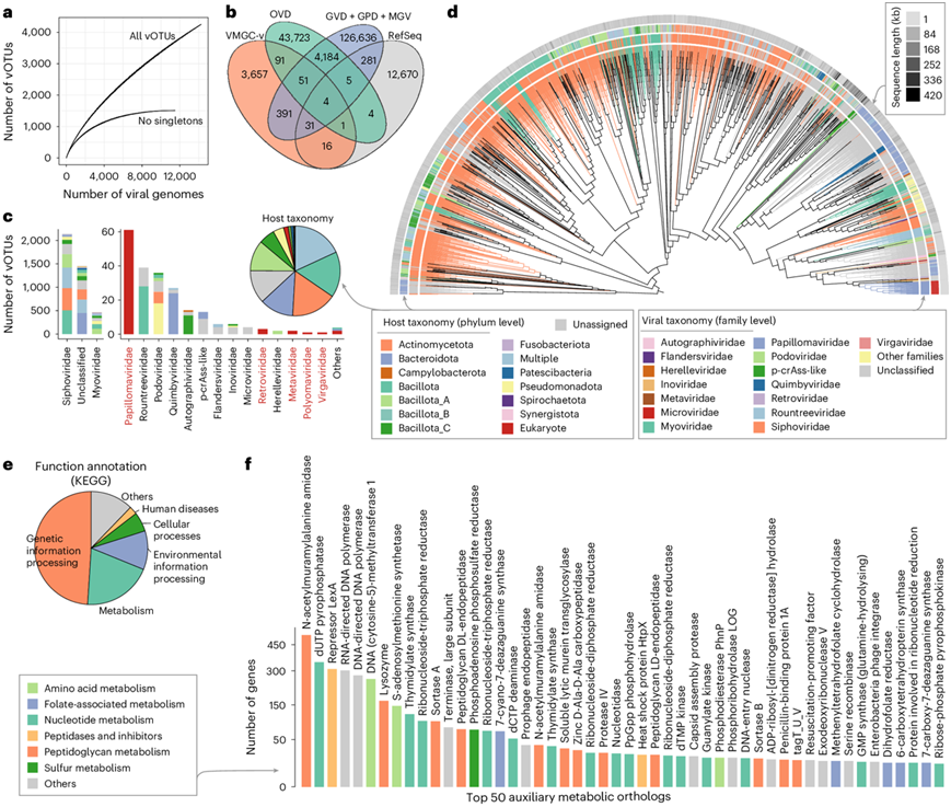 (a) 随着病毒基因组数量的增加,vOTU 的积累曲线。(b) 几个大型病毒基因组目录中病毒种类的重叠。(c) 4263 个 vOTU 的宿主门分布。(d) 蛋白质组树显示 4263 个 vOTU 之间的关系。(e) 4263 个 vOTU 中 KEGG 注释基因的功能分布。 (f) 4263个 vOTU 中前 50 个辅助代谢直系同源物的基因数量。