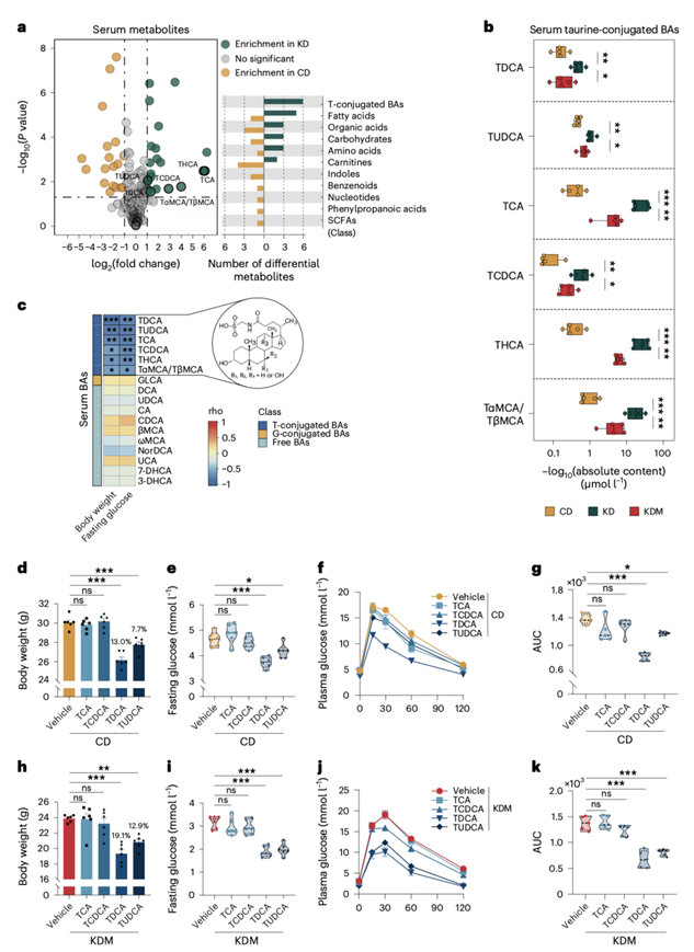 (a) CD组和KD组小鼠血清代谢物的火山图。(b) 箱线图显示CD喂养、KD喂养和KDM喂养小鼠血清中6种牛磺酸结合的BA水平。(c) 热图显示CD、KD和KDM喂养小鼠的血清BA水平与体重和空腹血糖水平的相关性。(d-g) TCA、TCDCA、TDCA或TUDCA处理3周后CD喂养小鼠的体重、空腹血糖、葡萄糖耐量试验(GTT)和相关的曲线下面积(AUC)。(h-k) TCA, TCDCA、TDCA或TUDCA治疗3周后,KDM喂养小鼠的体重、空腹血糖、GTT和相关的AUC值。