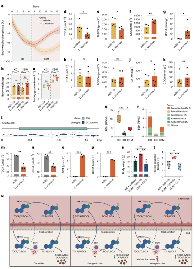 他们对L. murinus ASF361的整个基因组进行了测序,以探索其调节TDCA和TUDCA水平的机制。数据显示,L. murinus ASF361含有一个编码胆汁盐水解酶 (BSH) 的编码序列(图4l),该酶催化共轭胆汁酸中酰胺键的水解。为验证BSH活性,他们将TDCA和TUDCA与厌氧培养的L. murinus ASF361共同孵育2天,并观察到培养基中TDCA和TUDCA显著减少,同时出现DCA和UDCA(图4m–p),表明L. murinus ASF361有效地将TDCA和TUDCA转化为DCA和UDCA。此外,在KD饮食的小鼠的盲肠内容物中,编码BSH基因的丰度显著降低,并且通过蛋氨酸补充得以恢复(图4q)。乳酸菌是CD、KD和KDM处理小鼠之间BSH基因丰度差异的主要驱动细菌(图4r)。为确认微生物BSH的作用,他们用GR-7(一种特定的微生物BSH抑制剂),给KDM饮食的小鼠进行胃灌注,观察到BSH的抑制阻断了蛋氨酸补充对体重和空腹血糖的影响(图4s-t)。
