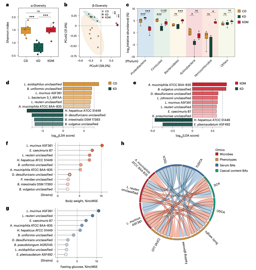 (a) 箱线图显示CD、KD和KDM喂养小鼠肠道菌群品系水平的α多样性。(b) 对菌株水平的宏基因组数据进行主坐标分析(PCoA),显示肠道菌群的β多样性。(c) 显示主要细菌门丰度的箱线图。(d-e) 采用线性判别分析效应量(LEfSe)图鉴定前10位菌株。(f-g) 通过随机森林回归均方误差(%IncMSE)检测到影响体重和空腹血糖增加的前10种细菌。(h) 显示菌株、血清BA、盲肠内容物BA与宿主代谢表型显著相关。