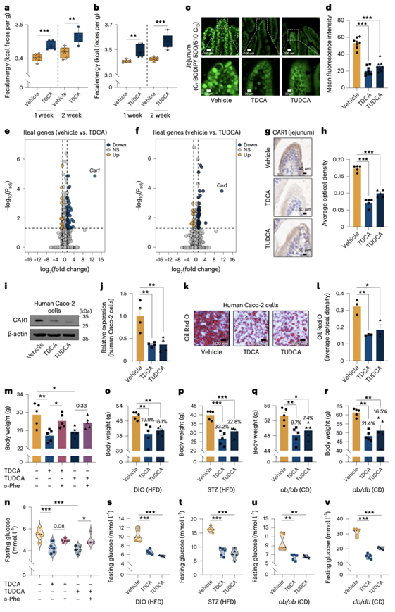 (a-b) TDCA处理后第1周和第2周的粪便能量和TUDCA处理后的粪便能量。(c-d) 肠道切片的代表性图像和荧光定量。(e-f) TDCA或TUDCA治疗的小鼠中差异表达的回肠基因的火山图。(g-h) 肠切片CAR1免疫组织化学染色的代表性图像和定量分析。(i-j) 在Caco-2细胞中加入PBS(对照),TDCA或TUDCA后CAR1的蛋白表达和通过调节β-actin对CAR1表达的统计分析。(k-l) Caco-2细胞油红O染色的代表性图像及定量分析。(m-n) 小鼠体重和空腹血糖。(o-r)小鼠体重分析。(s-v)空腹血糖分析。