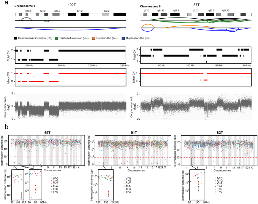 (a) 两例具有染色体碎裂 CN 振荡特征的侵袭性病例的SV和 CNV 谱。 (b) 显示具有局部超突变的 3 个 GIST 的突变间距离与基因组位置的关系。