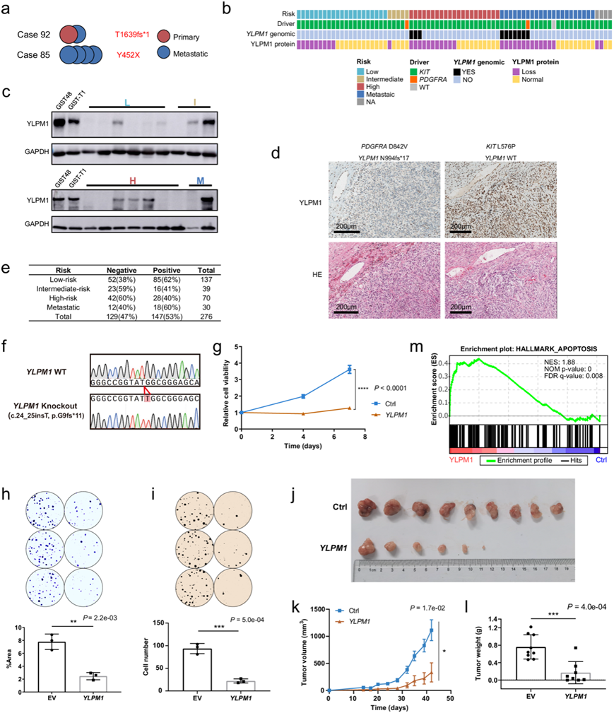 (a) 来自同一患者的多个肿瘤具有相同的YLPM1突变。(b) 73 个 GIST 中的 YLPM1 基因组和蛋白质畸变总结。(c) 免疫印迹分析。(d)免疫组织化学(IHC)分析。(e) 通过IHC评估的组织微阵列验证队列中的 YLPM1 表达总结。(f-m) YLPM1 的恢复抑制了YLPM1失活 GIST中的肿瘤生长和增殖。
