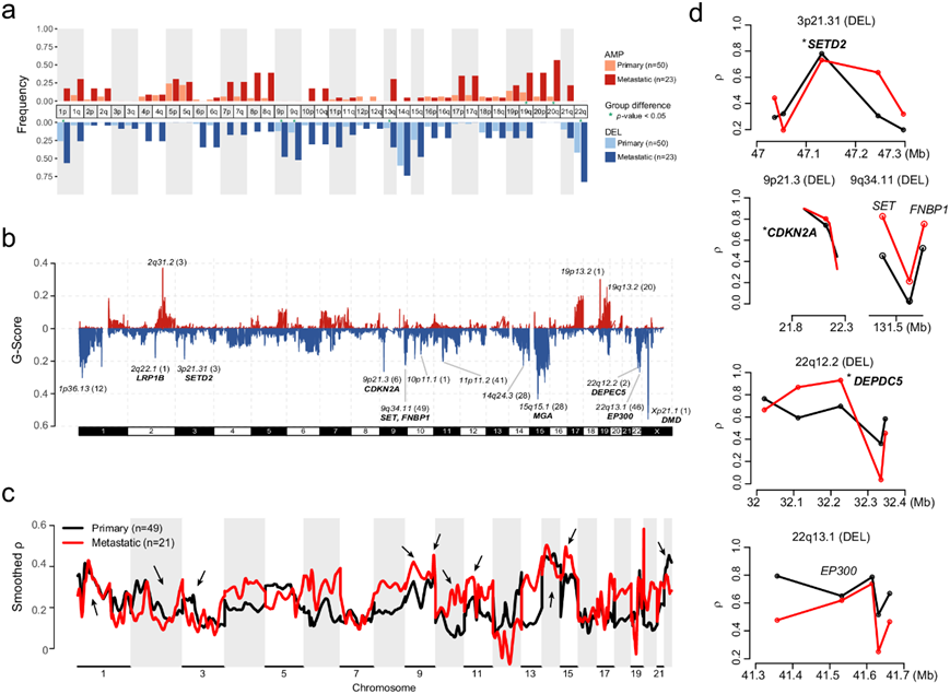 在局部 CNV 中,共检测到 15 个峰区域(涉及 211 个基因),缺失明显多于扩增(图 4b)。复发性缺失包括几个已知的肿瘤抑制基因(CDKN2A、DEPDC5和DMD),这些基因主要发生在高风险或转移性 GIST 中(图4b)。局部 CNV 峰中的其他癌基因包括SET和FNBP1(9q34.11 缺失),也在高风险或转移性 GIST 中富集。