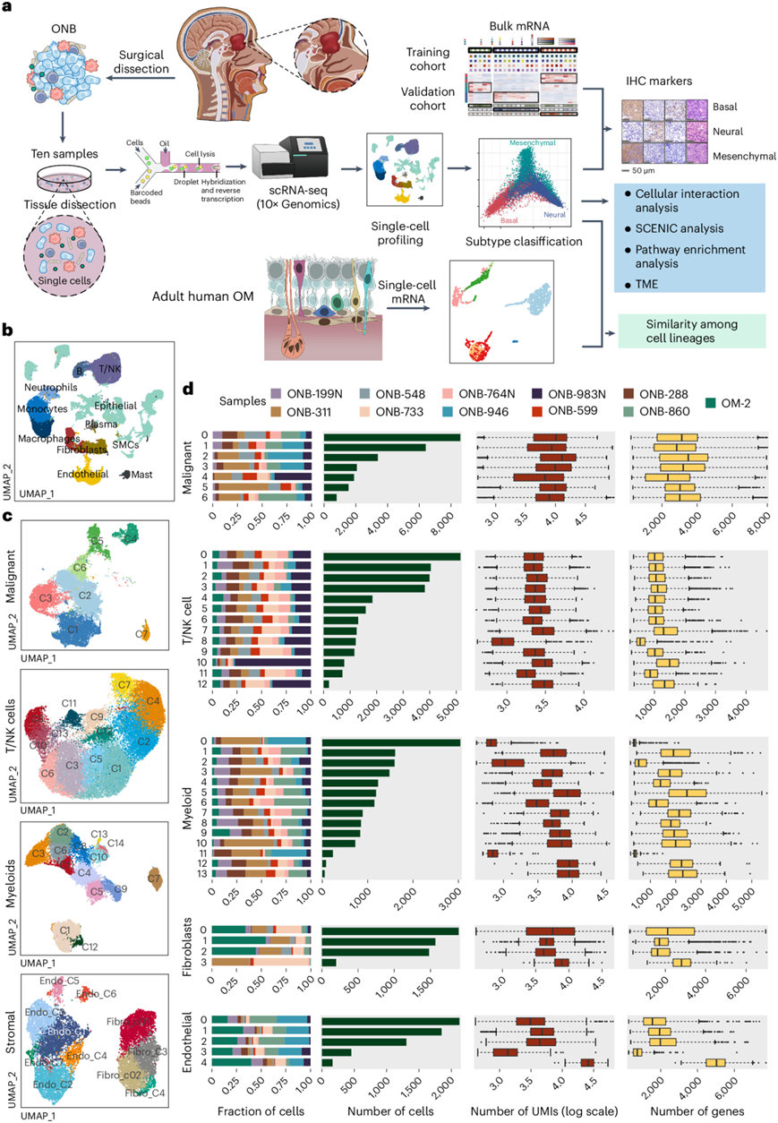 为了破译ONB肿瘤的细胞图谱,研究团队按照简单的工作流程(图1a)使用了内镜肿瘤切除术中获得的10个ONB样本的scRNA-seq图谱,以及从基因表达综合(GEO)数据集(GSE139522)中检索到的1个成人OM样本。总共获得了96,325个细胞的转录谱,包括来自10个ONB样本的85452个细胞和来自对照OM样本的10873个细胞。