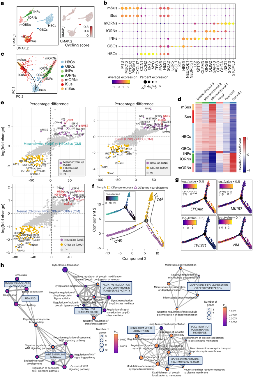 (a) UMAP可视化。(b) 嗅觉神经元和支持谱系标记表达水平的点图。(c) 基于 Slingshot 预测的主成分分析的基因表达谱的二维表示。(d) 热图显示恶性 ONB 亚群(列)和嗅觉上皮细胞(行)之间表达谱的 Pearson 相关性。(e) 散点图显示 NBM 肿瘤细胞和与这些恶性亚型对应的嗅觉上皮亚聚类之间的 DEG。(f) 伪时间轨迹分析。(g) 来自 ONB-311 的嗅觉上皮细胞和恶性细胞的发育轨迹。(h)网络分析。