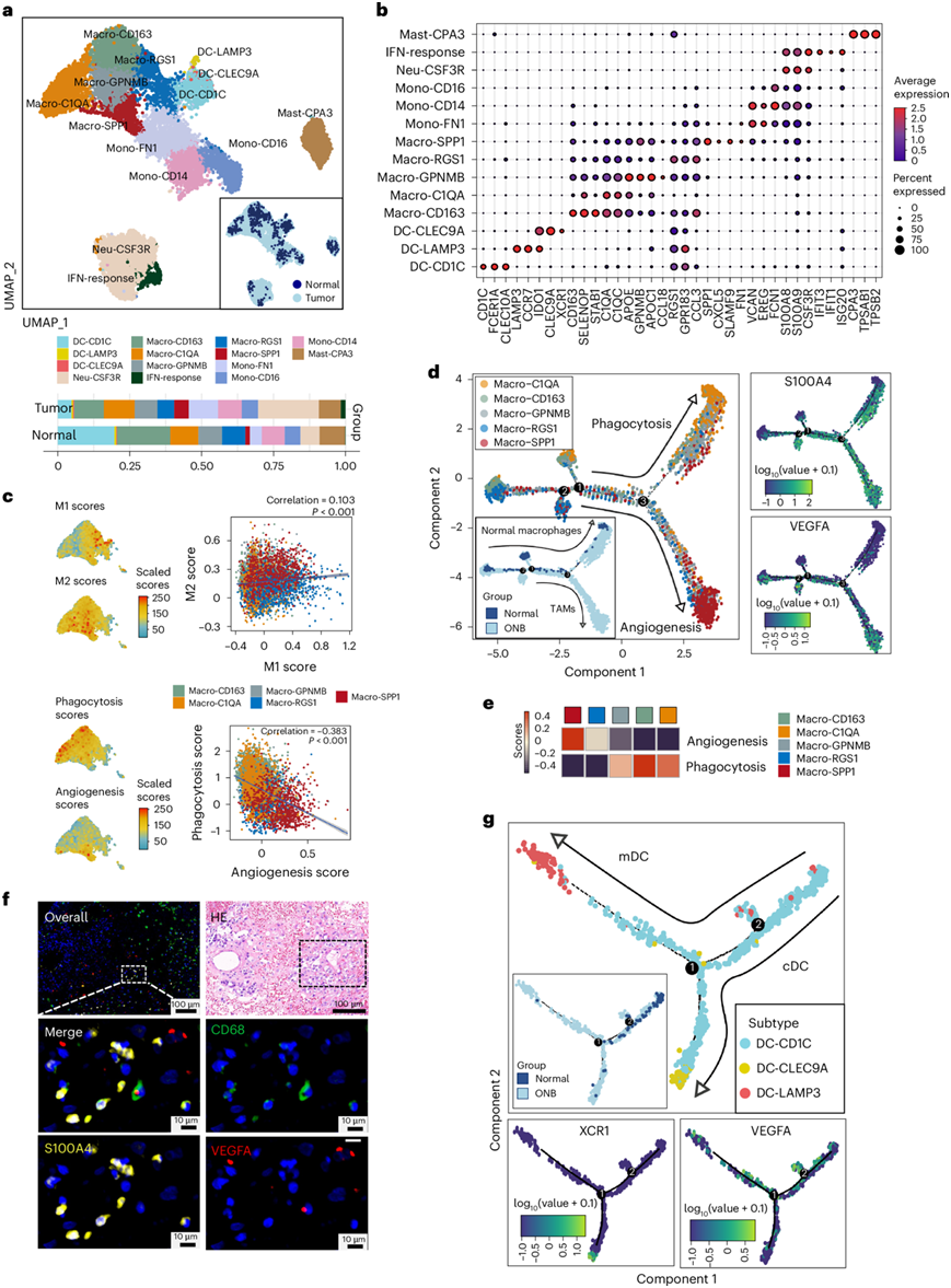 (a) UMA P可视化。(b) 标记基因在14个髓细胞亚群中的表达水平。(c) UMAP图显示巨噬细胞的M1和M2评分水平,吞噬和血管生成评分,Pearson相关性的散点图。(d) 推断巨噬细胞的发育轨迹。(e) 热图显示ONB巨噬细胞亚群中吞噬相关和血管生成相关特征基因的不同表达模式。(f) ONB组织巨噬细胞特征蛋白的免疫荧光染色。(g) 树突状细胞(DC)的发育轨迹。