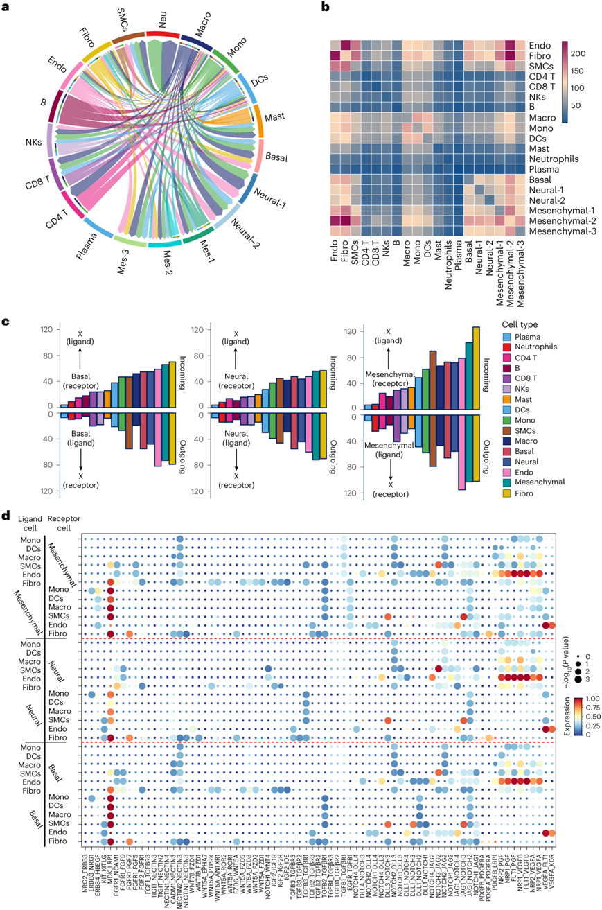 (a) 环状图显示了ONB TME中不同细胞类型之间的细胞间相互作用。(b) 热图显示了CellphoneDB预测的ONB TME中不同细胞类型之间潜在配体-受体对的数量。(c) 条形图描绘了恶性神经细胞、基底细胞和间质ONB细胞和指示细胞类型之间假定的受体-配体相互作用的数量。(d) 点图显示ONB中基质细胞、髓细胞和恶性细胞之间的间充质配体-受体相互作用,按间充质(上)、神经(中)和基底(下)肿瘤亚型分开。