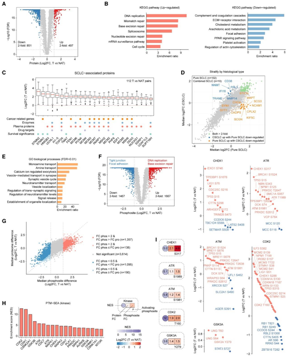 (A) 火山图显示肿瘤和配对 NAT 之间差异表达的蛋白质。(B) 蛋白质增加和减少的代表性 KEGG 途径。(C) 箱线图显示肿瘤与 SCLC 相关蛋白的配对 NAT 之间的变化,并由人类蛋白图谱注释了潜在的临床实用性。(D) 散点图显示两种 SCLC 组织学类型(CSCLC、组合 SCLC)中肿瘤和配对 NAT 之间蛋白质变化的比较。(E) GO分析。(F) 火山图显示肿瘤和配对 NAT 之间差异表达的磷酸位点。(G) 散点图描绘了磷酸位点及其相应蛋白质之间丰度变化的比较。(H) 通过 PTM 特征富集分析 (PTM-SEA) 评估肿瘤和配对 NAT 之间的显著激酶特征。(I) 该图显示根据其底物的磷酸化水平和相应的激酶激活位点推断出活性增加的激酶。(J) 点图显示激酶底物磷酸化的变化。