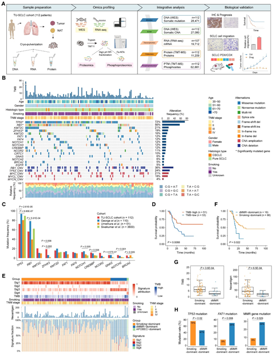 (A) SCLC 蛋白质组分析的实验工作流程。(B)所有 112 名 SCLC 患者的基因谱和相关临床病理特征。(C) TU-SCLC 队列与其他已发表的 SCLC 队列之间突变频率的比较。(D) 基于 TMB(对数秩检验)的总体生存 Kaplan-Meier 曲线。(E) 基于突变特征比例的 SCLC 肿瘤聚类。(F) smoking-dominant和 dMMR-dominant的患者总生存率的 Kaplan-Meier 曲线。(G) smoking-dominant和 dMMR-dominant肿瘤之间 TMB 和预测新抗原的比较。(H) smoking-dominant和 dMMR-dominant肿瘤之间TP53、FAT1和 MMR 相关基因(MSH2、MSH6和PMS2 )突变率的比较。
