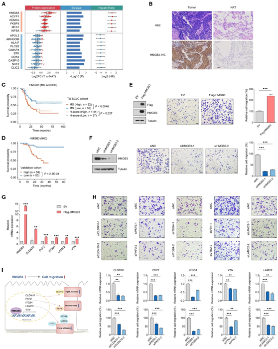 (A) 代表 16 种候选预后蛋白的图表。(B) 肿瘤和配对 NAT 上 HMGB3 的代表性苏木精和伊红(H&E) 和免疫组织化学 (IHC) 染色图像。(C) 基于 HMGB3 蛋白质组丰度或免疫染色评分(对数秩检验)的总体生存 Kaplan-Meier 曲线。(D) 基于独立 SCLC 队列中 HMGB3 免疫染色评分的 Kaplan-Meier 总生存曲线。(E-F) HMGB3 过表达或敲低对 SCLC 细胞迁移的影响。(G) 与载体对照相比,过表达 HMGB3 的 H345 细胞中代表性 HMGB3 靶基因的实时 qPCR 验证。(H) CLDN10、PKP2、ITGB4、VTN 和 LAMC2 敲低对 SCLC 细胞迁移的影响。(I)HMGB3 在 SCLC 细胞迁移中的作用的示意性工作模型。