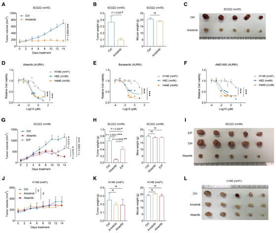 他们检测了RTK 抑制剂安罗替尼在包括 SC022、SC224 和 DMS114 在内的多个 nmf3 PDX/CDX 模型中的治疗效果。在所有三种 nmf3 肿瘤模型中均观察到对肿瘤生长的强烈抑制(图7A-C),而在 nmf1 肿瘤模型(H146 和 SC234)中未观察到明显的抑制(图 7J-L)。他们分析了 AURK 抑制剂(alisertib、barasertib 和 AMG-900)对 nmf4 SCLC 细胞系(H82 和 H446)以及 PDX/CDX 模型(SC222 和 H446)的作用。与 nmf1 亚型 (H146) 相比,nmf4 细胞系对 alisertib、barasertib 和 AMG-900 治疗更敏感(图7D -7F)。此外,alisertib治疗显著抑制nmf4 PDX/CDX模型中的肿瘤生长(图7G-I),而在nmf1肿瘤模型(H146和SC234)中几乎没有引起任何抑制(图7J-L)。