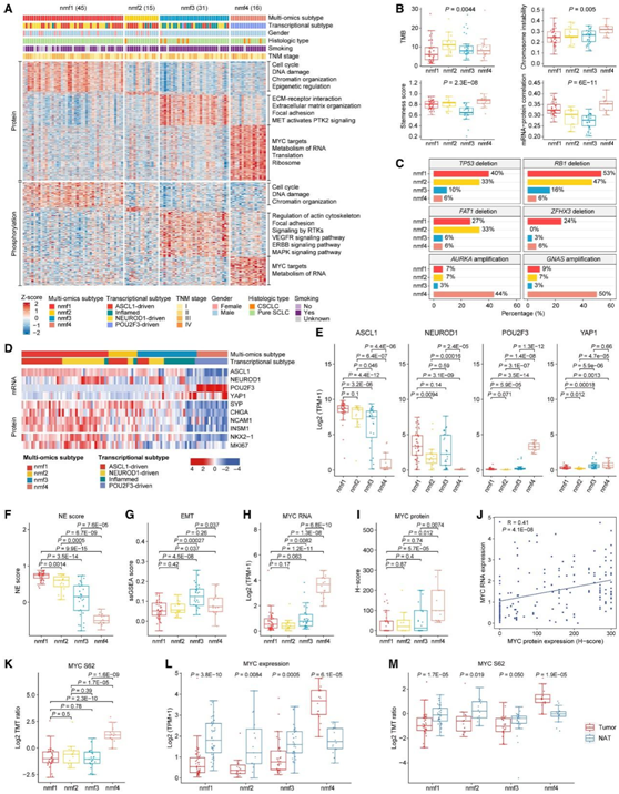 (A) SCLC 肿瘤的综合多组学分类为四种 NMF 衍生亚型。(B) 跨多组学亚型的 TMB、染色体不稳定性 (CIN)、干性评分和 mRNA-蛋白质相关性的比较。(C) 每个亚型具有 CNA 的特定基因的百分比。(D) 热图显示多组学亚型中ANPY的相对 mRNA 表达、神经内分泌标记物、甲状腺转录因子 1 (TTF-1/NKX2-1) 和增殖指数标记物 Ki-67/MKI67 的蛋白表达。(E) 多组学亚型之间 ANPY 表达的比较。(F-G) 比较从不同亚型的蛋白质组数据推断的 NE 分数和 EMT 分数。(H-I) 通过 IHC 检测比较不同亚型的 MYC mRNA 丰度和蛋白质丰度。(J) 散点图显示 MYC mRNA 与蛋白质丰度(H 分数)的 Spearman 相关性。(K) 不同亚型的 MYC S62 丰度比较。(L-M) 分别比较每个亚型中肿瘤和配对 NAT 之间的 MYC mRNA和 MYC S62磷酸位点丰度。