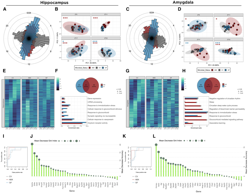 (A, C) 对海马体和杏仁核进行节律性分析后,所有转录本的峰值期图。(B, D) 在每个评估时间点对海马体和杏仁核转录组进行主成分分析。 (E,G) CV 小鼠的节律基因热图。(F,H) 维恩图和针对海马和杏仁核中失去节律性的基因的靶向富集。(I,K) 随机森林模型的接收者操作特性曲线显示了分类模型在海马体和杏仁核中的表现。(J,L) 用于在海马体和杏仁核中生成随机森林模型的每个变量的重要性图。