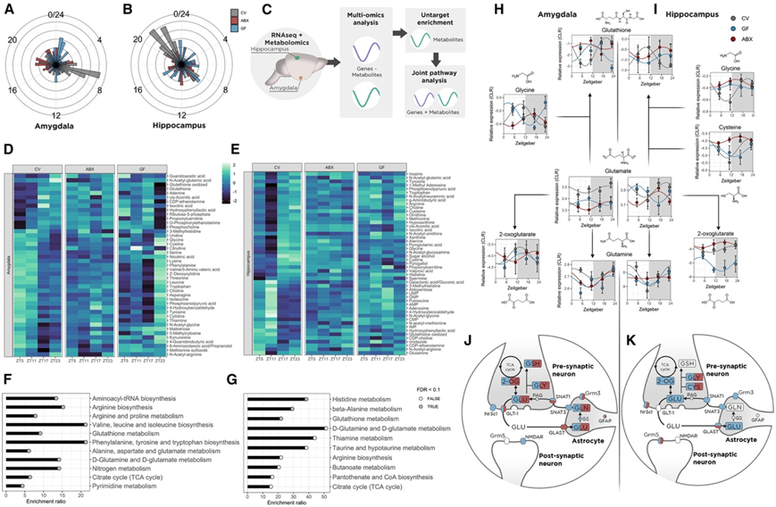 (A-B) 波动代谢物的峰值相图。 (C) 多组学分析示意图。(D-E) 海马体和杏仁核中波动代谢物的热图。(F-G) 功能相关基因相关的代谢物的非靶向富集。(H-I) 杏仁核和海马中谷氨酸代谢的代表性通路。(J-K) 示意图表示杏仁核和海马中三部分突触中的谷氨酸代谢信号。