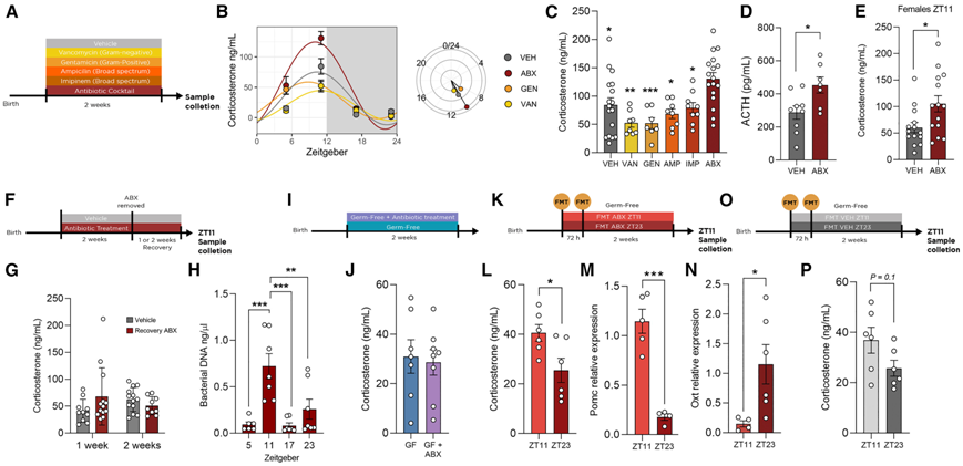 (A) 实验设计示意图。(B) 接受不同抗生素处理的全天皮质酮血浆水平。(C) 接受不同抗生素处理的动物在 ZT11 时的血浆皮质酮水平。(D) ZT11 时的血浆 ACTH 水平。(E) 雌性小鼠在 ZT11 时的皮质酮水平。(F) 实验设计示意图。(G) 恢复 1 或 2 周后的皮质酮水平。(H) ABX 小鼠的盲肠细菌 DNA。 (I) 实验设计示意图。(J) GF 小鼠和用抗生素处理的 GF 小鼠在 ZT11 时的皮质酮水平。(K) 实验设计示意图。(L) 从在 ZT11 或 ZT23 收集的 ABX 小鼠接受 FMT 的 GF 小鼠在 ZT11 时的皮质酮水平。(M-N) ZT11 时垂体中Pomc的表达和PVN 中Oxt的表达。(O) 实验设计示意图。(P) 在 ZT11 和 ZT23 收集的 VEH 小鼠接受 FMT 的 GF 小鼠的皮质酮水平。