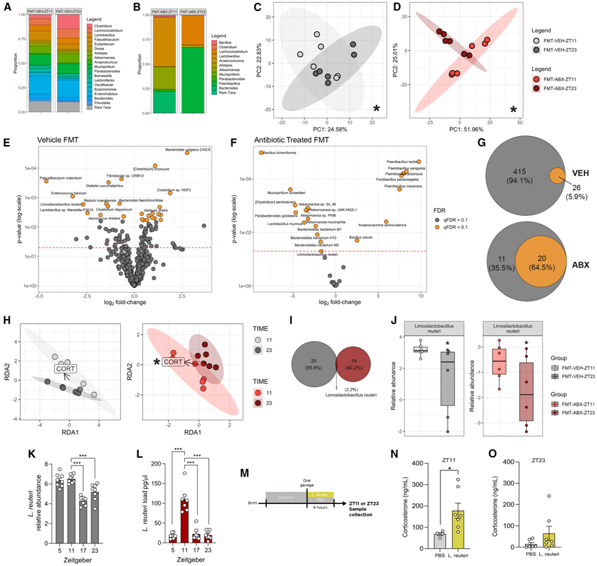 (A-D) 条形图比较了 VEH和 ABX供体的 FMT 接受者的微生物群组成。(E-F) 火山图显示了 FMT 接受者盲肠中随时间变化的微生物。(G) 维恩图显示了 FMT 接受者中细菌分类群发生改变的百分比。(H) 对 VEH 和 ABX 供体的 FMT 受体的微生物组成和皮质酮进行三重冗余分析。(I) 维恩图显示了 VEH 和 ABX 的 FMT 受体中 ZT11 和 ZT23 之间发生改变的细菌类群之间的交集。(J) FMT 接受者中Limosilactobacillus reuteri的相对丰度。(K) VEH 小鼠Limosilactobacillus reuteri的相对丰度。(L) ABX 小鼠盲肠内容物中Limosilactobacillus reuteri的全天定量分析。(M) 实验示意图。(N-O) ZT11和 ZT23时收集的Limosilactobacillus reuteri口服管饲后的皮质酮水平。