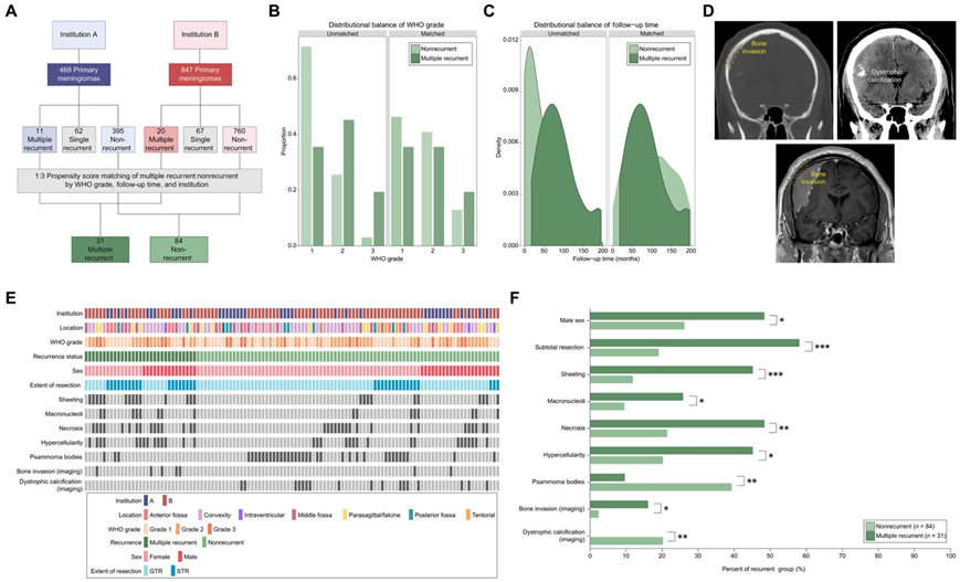 研究团队回顾性分析了 1186 名原发性脑膜瘤患者。其中 31 名原发性肿瘤出现多次复发,即治疗后放射学复发≥2 次,1155 名患者仍未复发(图 1A)。与非复发性脑膜瘤 (NRM) 患者相比,MRM 患者的随访时间明显更长,WHO 分级更高。匹配前,每个机构的 MRM 和 NRM 患者分布相对均匀。为了比较这些脑膜瘤组,他们进行了倾向评分匹配 (PSM),根据随访时间、WHO 分级和机构匹配 MRM 和 NRM 患者。