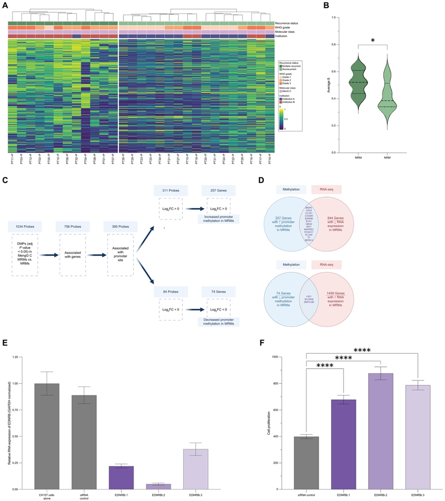 (A) 监督聚类热图比较MenG C 脑膜瘤中MRM 与 NRM的前 10000 个变化最大的探针 (MVP) 。(B) 比较 MRM和 NRM之间前 10000 个 MVP 的平均 beta 值。(C) 对 MRM 和 NRM 之间的差异甲基化探针 (DMP) 进行定量,重点关注与基因相关的启动子位点探针。(D) 比较 MRM 和 NRM 时 (C) 中的甲基化分析和 RNA-seq 分析数据中基因的重叠。(E) 逆转录 - 定量聚合酶链反应 (qPCR) 验证CH157 脑膜瘤细胞系中三种不同EDNRB小干扰 RNA (siRNA) 构建体的敲低效率。(F) CH157 细胞中每个 siRNA 构建体的细胞增殖。