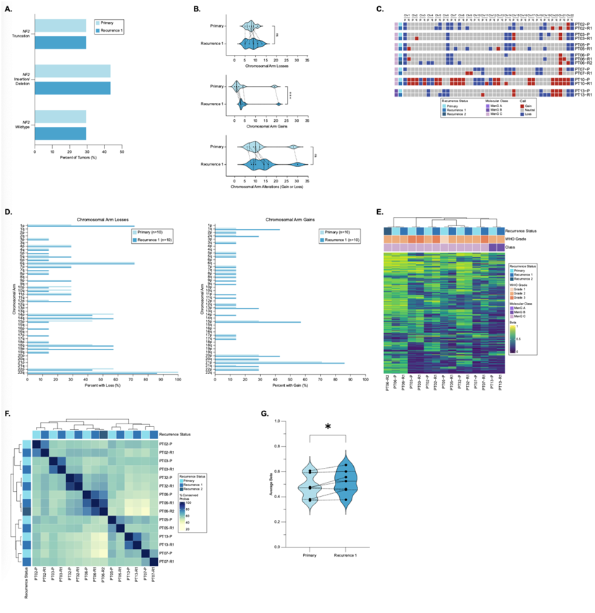 (A) 对匹配的原发性和复发性全切除(GTR)的多发性复发脑膜瘤(MRM)的NF2变异进行定量分析表明,任何NF2变异类型的原发性和首次复发之间没有差异。(B) GTR原发肿瘤和匹配的首次复发肿瘤之间臂水平的拷贝数差异。(C) GTR原发和匹配的复发肿瘤的染色体臂增益和缺失。(D) 直方图表示总染色体臂的增益和损失。(E) 无监督聚类热图比较匹配的GTR初次和首次复发样本的前10000个最可变探针(MVP)。(F) 原发肿瘤全切除样本中保守甲基化状态的前10000个MVP百分比的热图。(G) 对每个全切除的MRM肿瘤中匹配的原发灶和复发灶1的10000个MVP的平均甲基化β值进行配对比较。